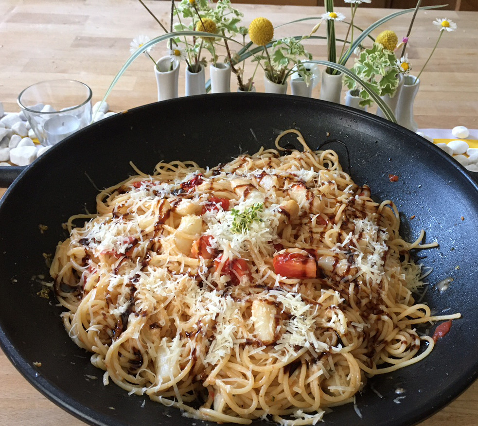 600 g Spargel, zwei Portionen Spaghetti, zwei mittelgroße Tomaten, etwas Balsamico-Creme (es geht aber auch normaler Balsamico), Zitronenthymian und Parmesan